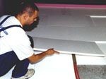A falak mentén Austrotherm peremszigetelő sávot kell elhelyezni, ami legalább 1 cm-rel nyúljon az aljzatbeton fölé. Az AT-L táblák fektetését az ajtótól legtávolabbi sarokban kell kezdeni. A lemezek soronként kötésben, szoros illesztéssel kerüljenek a födémre. A kiegészítő hőszigetelést ugyanígy kell fektetni. Ha a födémen gépészeti vezetékek futnak, azokat az alsó rétegként terített kiegészítő hőszigetelésben kell elhelyezni.