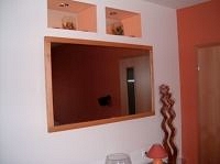 A keret eloxált alumínium, fehér porszórt vagy fa kivitelű lehet. Az üveg- és tükörpanelek keret nélküli, különösen elegáns darabok.