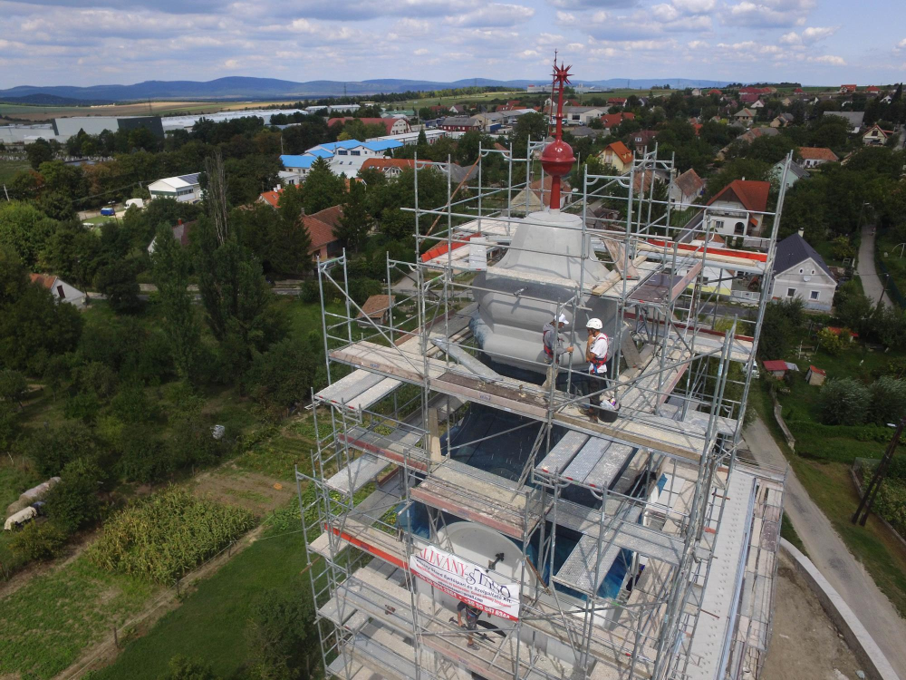 A felújítandó felületen jól láthatóak voltak a korábbi kent szigetelések nyomai, repedezett, töredezett, hiányos felülettel. A feladat a betonkupola csapadékvíz elleni szigetelése és egyben a szerkezetbe korábban bejutott nedvesség eltávozásának biztosítása volt, de a megjelenés is számított, ezért a megrendelő az eredeti betonozott felülethez legjobban hasonlító RAL 7030 szín mellett döntött.