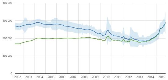 Az ingadozás másik oka, hogy nagyon alacsony a lakásépítések száma, és így akár egy-egy projekt is markáns változásokat hoz a statisztikában. Érdekes, hogy míg a válságot megelőző években negyedévente 10 ezret is meghaladta az új építésű ingatlanok száma, mára ez tartósan 2000 körüli értékre csökkent.