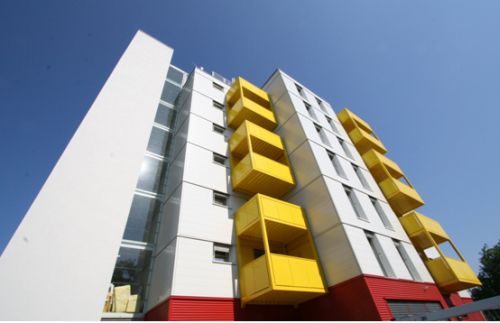 A közel negyven éve épült magasházban működő idősek otthonából Hoesch Planeel® Siding homlokzatburkolati rendszerrel 32 lakásos passzív társasházzá alakított St. Koloman épület energiaköltségei 90%-os csökkenést mutatnak. Lakóházról lévén szó, a korrekt attika megoldások, sarokcsatlakozások a rendszerbe illő élhajlított takaróelemek, valamint a színek kombinációja egyúttal igényes megjelenést is kölcsönöz az épületnek.