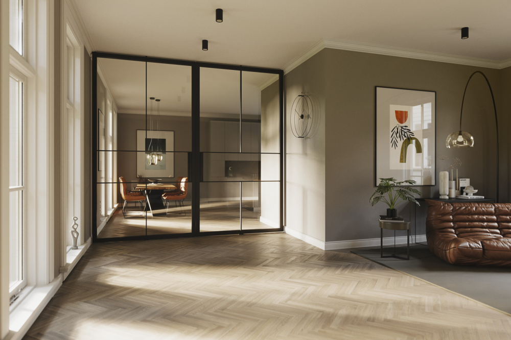Az ajtók alapfelszereltségként Slim üvegezőléccel érkeznek, ami tovább hangsúlyozza a minimalista profil megjelenését. A nyílószárnyas ajtók forgóajtóként való kialakítása tovább fokozza ezt a hatást. Az ajtószárnyak pántjai közvetlenül a padlóhoz, a mennyezethez vagy a szemöldökhöz rögzítettek, így az ajtók könnyedén fordulnak el a függőleges tengelyük körül mindkét irányban. A forgáspont egyedileg meghatározható. Ez a típusú beépítés nem igényel ajtótokot, ami helytakarékos megoldást kínál, és hozzájárul a letisztult, minimalista megjelenéshez. A forgóajtók maximális szárnyszélessége 2000 mm, magasságuk pedig akár 3000 mm is lehet. Ideális megoldást nyújtanak olyan átjárókhoz, ahol egyébként kétszárnyú vagy oldalelemes ajtókra lenne szükség. Az egyforma ajtómotívumoknak és osztóléces felosztásoknak köszönhetően a forgóajtók tökéletes harmóniát alkotnak a Hörmann acél loftajtó-program nyílószárnyas ajtóival.