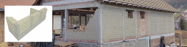 A szerkezetkész vályogtégla vázkitöltő falazatú épület (a fürdő résznél 30 cm-es B-FORM, az oromzatnál 18 cm-es B-FORM falazattal)