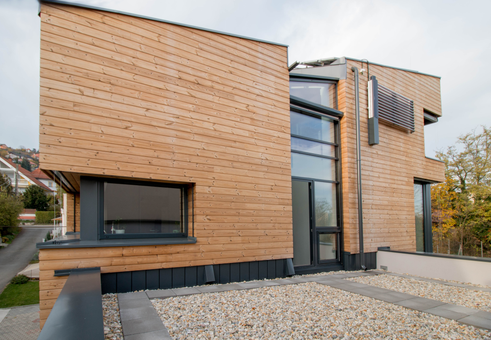 A homlokzatra Thermowood faburkolat került, mely a 150 fokos hőkezelésnek köszönheti rendkívül tartós időjárás-állékonyságát. A lábazat rendkívül magas szintű korrózióvédelmet nyújtó Lindab lemezzel burkolt, a műanyag nyílászárók pedig kívülről alumíniumburkolatot kaptak.
