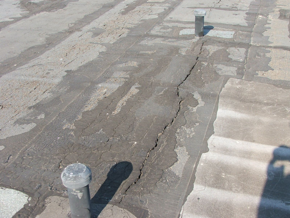 A bitumenes lemezzel szigetelt tetőfelületen is lehetnek olyan repedések, felgyűrődések, elhúzódások, amelyek jelzik a felszín alatti rétegek mozgásait. Ezeket a mozgásokat mindenképpen mechanikai rögzítésekkel kell megfogni. Természetesen a tető szegélyei mentén láthatóak a leginkább a meghibásodások. Az eresz és az orom bádogos szerkezete sok esetben elkorhadt, a rávezetett szigetelés elrepedt. Ha középre lejt a tető, az itt látható összefolyók eltömődtek, a növényzet is megtelepedett már.