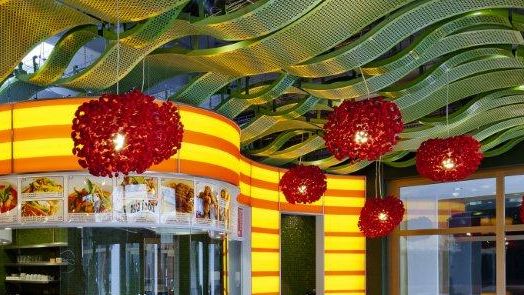Az ausztriai Parndorf bevásárlóközpontjának egyik éttermében, a Bistro Asia Cocosban a Mevaco alumíniumból készült, Creative Line Arabica perforált lemeze gondoskodik a tenger illúziójának megteremtéséről. Az ötletes hullámok az ügyesen elhelyzett LED-világítással varázslatos fény-árnyék hatást hívnak életre.