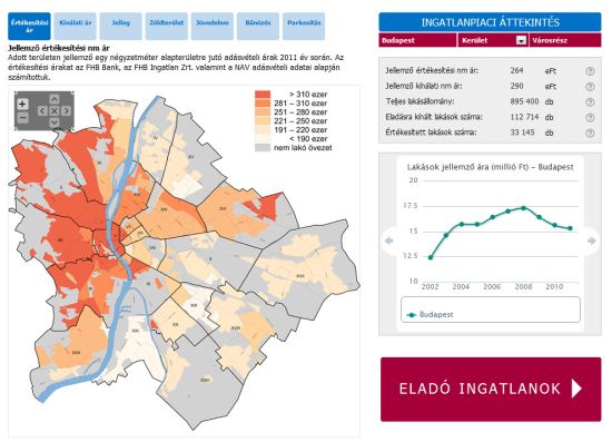 Az Otthontérkép egy jellemző oldala: a jellemző értékesítési árak Budapesten (Forrás: FHB, www.otthonterkep.hu)