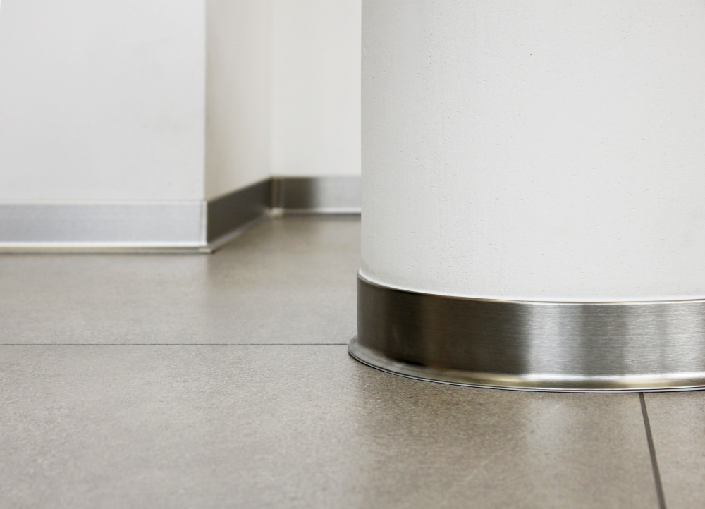 Az alumíniumprofilok alkalmazhatók a faltőben lábazati csempe helyett, de kitűnő megoldást nyújtanak szögletes és kör keresztmetszetű pillérek lábazatképzésében is, a burkolat és a függőleges sík stílusos kapcsolódására.