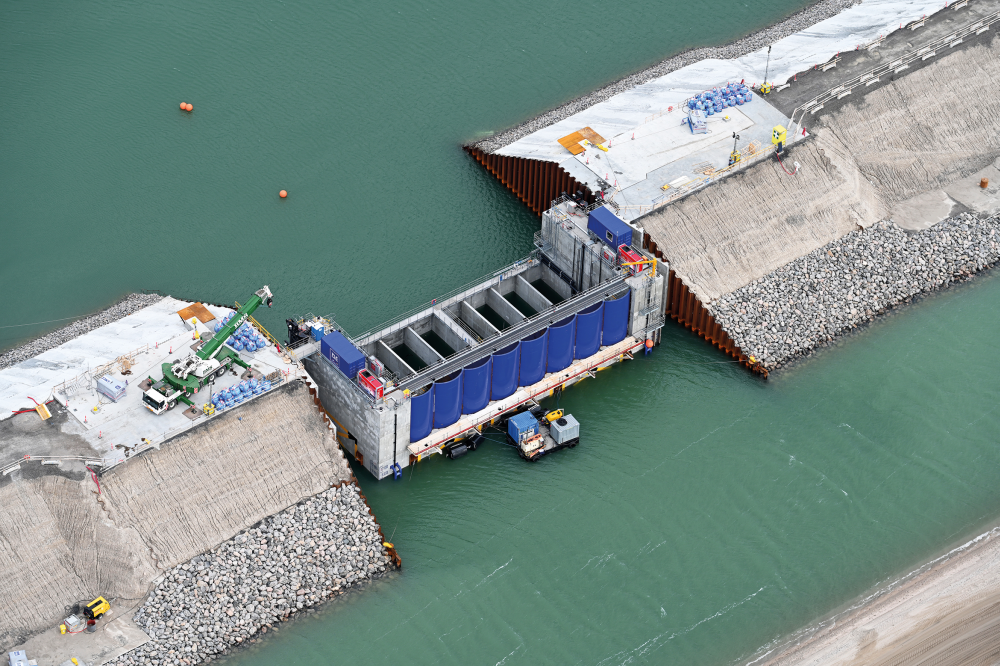 Egy közel 50 méter hosszú mobil zsilipkapu teszi lehetővé a szárazdokk lecsapolását és elárasztását. A zsilipkaput a megfelelő dokkportál oldalfalai közé vontatják − attól függően, hogy melyik gyártósorról jönnek a kész elemek. A 21 méter magas és 6.000 tonna súlyú úszó zsilipkaput ezután az adott szárazdokk portálban pozícionálják, majd négy nagy teljesítményű szivattyú nyolc kamrán keresztül pumpálja be a tengervizet a dokkba, illetve szivattyúzza ki onnan. Egy-egy ilyen művelet mintegy öt napot vesz igénybe.