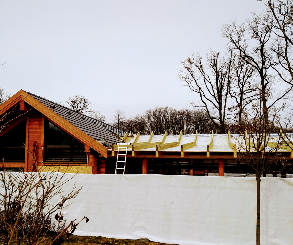 A tetőszerkezetet emelt magasságú szarufa képezi 15+5 cm vastagságban, megfelelő párazárással alul, illetve tetősík fóliával közvetlenül a héjalás alatt. Az itt beépített anyag még a szúrós típus, porzik, igazi kihívás vele dolgozni.