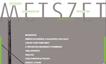 A Széll Kálmán tér felújítása az új Metszet központi témája, míg a többi cikkben a Tate londoni bővítése, az Erste új bécsi központja és a Brazil Mendes da Rocha életútja kerül terítékre. A magyar példák között a DMB iroda, Győrffy Zoltán, Krizsán András, Salamin Miklós egy-egy középülete és az Egri Érsekség felújítása szerepel.