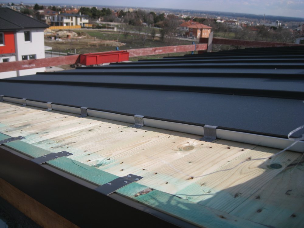 Alátéthéjazatként Creaton Duo páraáteresztő, szélein gyári ragasztósávval rendelkező fóliát építettek be. Az 5 cm magasságú légréteg felett teljes felületű deszkázat készült a kettős állókorcos fedés számára. A beszellőzőrések a négyszögszelvényű függő ereszcsatornák takarásában, a kiszellőzőnyílások pedig a nyeregtető gerincén nagy gonddal elkészített felépítményben találhatók. A hőszigetelt, fehérre színezett homlokzat kontrasztjaként a Prefa-fedés fekete színű. E fémlemez fedést – mint számos alkalommal máskor is –, a Szántó Fivérek és Kozma Kft. segítségével készítették el, velük is előre egyeztetve és megtervezve az alkalmazott műszaki megoldásokat.