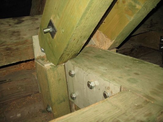 - a megnövekvő héjazati terhelés miatt a barokk keretállások keresztmetszeti megerősítése is szükséges volt, amelyet a feszítődúc és a hozzá símuló szarufa, illetve a mellszorító és a rajta lévő torokgerenda megfelelő sűrűségű összecsavarozásával, s ezáltal együttdolgozóvá tételével értünk el (ahol a feszítődúc és a szarufa között eredetileg rés volt, ott az együttdolgozást keményfa betétekkel is növeltük);
