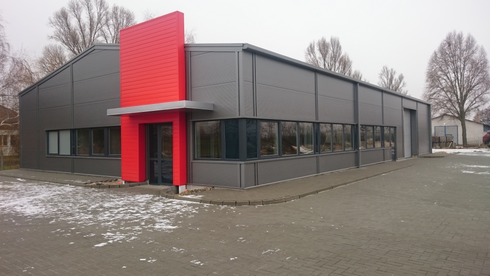 A 383 m2 alapterületű acélcsarnok a gyártó és a tervező közös munkájának pontosságát dicséri, megmutatva egy standard csarnok egyedivé válásának útját. A tervezés és kivitelezés folyamán kihasználták a standardizált rendszer előnyeit, miközben rugalmasan a megrendelői igényhez alakították az épületet. Ebben a Frisomat tervezői támogatása és rugalmassága természetesen elengedhetetlen volt. A feladattal a tervező nem marad egyedül, mindenkor számíthat a Frisomat mérnökeinek segítségére: részletrajzok, csomópontok, valamint statikai számítások, tűzvédelmi szakértői támogatás is segíti a tervezést. Bármilyen acélcsarnokról legyen is szó, a felek együttműködése azonos: az építész a kreativitásával és a tapasztalatával segíti a megbízót, a Frisomat pedig az eszközrendszerével támogatja a tervezőt.