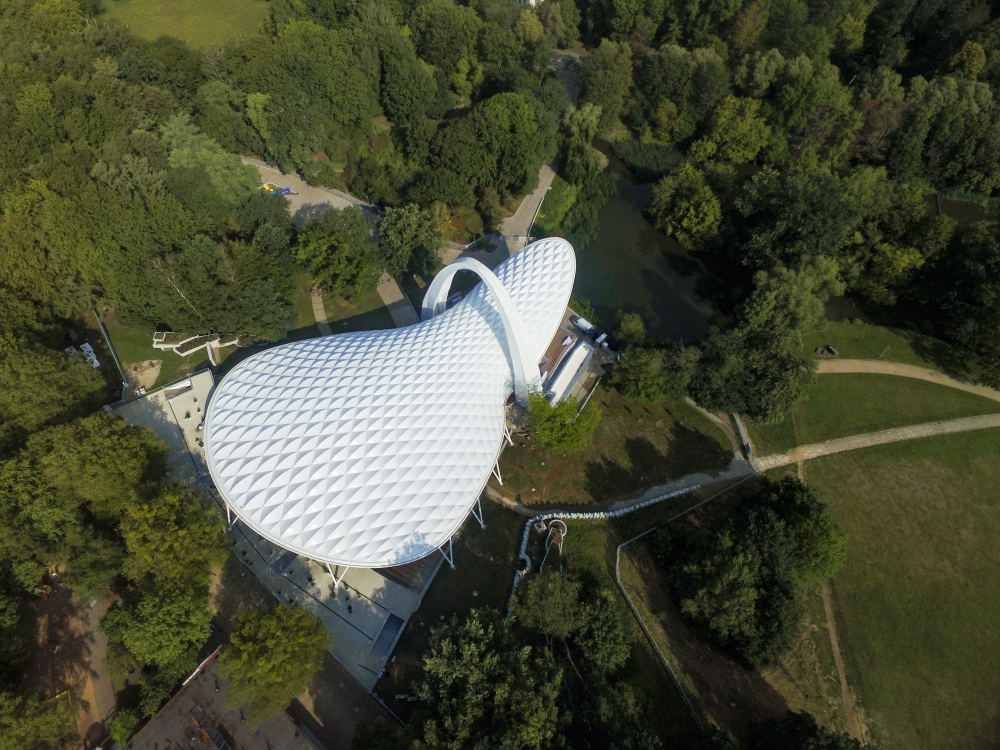 Az elkészült tetőszerkezet lombkoronaszerű kialakítása könnyed megjelenést eredményezett, miközben kimagasló akusztikus teljesítményt garantál a színpadon. A színpadot és a nézőteret lefedő lombkorona váza kagyló alakú acélrács szerkezet, aminek külső felületét Flexlight Advanced 1002 S2-vel vonták be. A rendkívüli ellenálló képességű és kiváló színtartóságú fehér szövet kiemeli a tető hullámzását és könnyedségét. A vázszerkezet belső oldalát Alphalia Silent AW akusztikus szövetpanelek borítják, melyek a környezeti zajok akár 65 százalékát is képesek elnyelni. Az anyag önmagában csökkenti a visszhangot, és kiváló akusztikai tulajdonságokat eredményez.