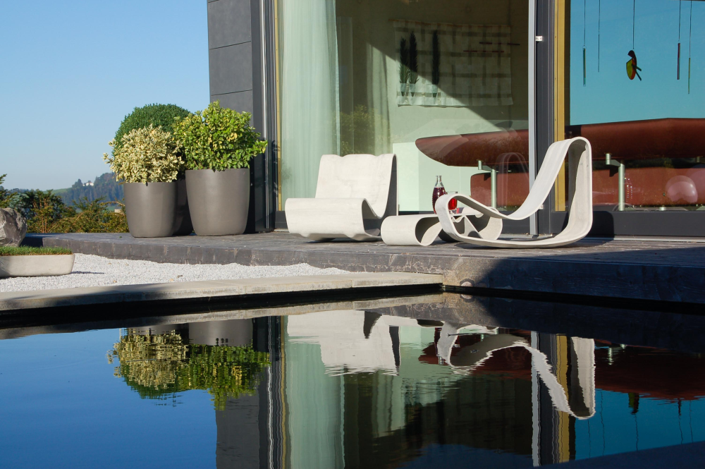 A Swisspearl az igazán egyedi formatervezési minták széles spektrumát és tökéletesen formázott kültéri bútorrendszert, valamint kiegészítőket (fekvőbútorok, asztalok, lámpák stb.) kínál a vásárlók számára.