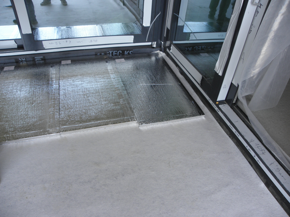 Ilyen problémás feladat az erkélyek hőszigetelése, hiszen az erkélyajtó által elválasztott külső és belső térben eltérő energetikai elvárásoknak kell megfelelni. Amíg kültéren a lapostetőkre vonatkozó szigorú hőtechnikai követelményeket kell teljesíteni, addig a belső, lakott térben – ahol fűtött terek helyezkednek el egymás alatt-felett – csak a lépéshangszigetelést kell megoldani. Ez azzal jár, hogy a lakótérben maximum 6 cm lépéshangszigetelést, míg az erkélyen ennél jóval vastagabb hőszigetelést kell elhelyezni.
