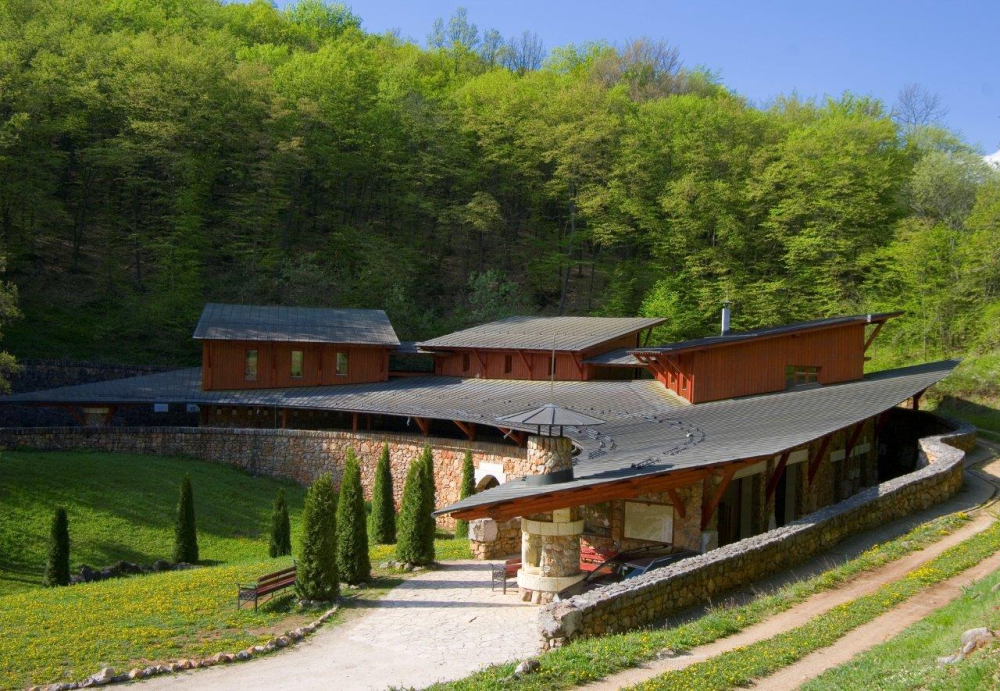 Az épületet – a köztes födém felületén látható – szilárd vasbeton szerkezet teszi masszívvá és időtállóvá, míg a függőleges felületek nyers, rakott kőfalak. A tető pedig hagyományos megoldásokkal operáló bonyolult és látványos ácsszerkezet, amely nem nélkülözi a modernnek számító, ívesre hajlított fönn és lenn, világosság és sötétség ellentétpárjainak ilyetén megjelenítésén felül a hatalmas szárnyat formázó tető két végén még elhelyezett további jelképes, de funkcionáló épületelemeket: a tűzhelyként használható „tűzsárkányt” és az ivókútként szolgáló „vízsárkányt”. A ház mintegy átvezeti a látogatót a profán felszíni valóságból a szakrális mélységbe és sötétségbe, ahogy halad szintről szintre lefelé, úgy lát egyre kevesebbet a fényből és a környező világból, lelkileg felkészül a barlang szokatlan, rideg és félelmes miliőjére. Ez nemcsak szellemi előkészítés, hanem egyben fiziológiai is, hiszen a szemnek alkalmazkodnia kell a barlang szükségszerűen alacsony megvilágítottságához, ami hosszú percekig is eltart, a fokozatosság pedig csökkenti a balesetveszélyt is.