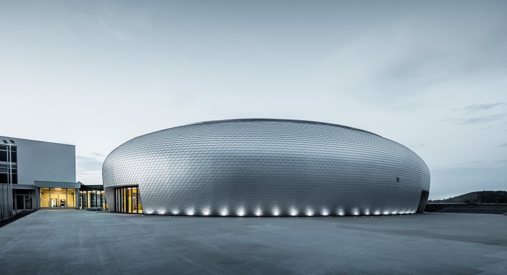 Az igényes és attraktív építészeti koncepció választ ad az aktuális követelményekre és az ismeretlen jövőre. Az ufóra történő asszociáció nem véletlen: „Ha éjjel a csarnok világítását felkapcsolják, és fényei megvilágítják az eget, azt hihetné az ember, hogy egy ufó szállt le” – meséli Aleš Kubalík. A csarnok kerek, sima és absztrakt formájú, kupolája által jobban igazodik az emberi léptékhez, fémes homlokzata pedig visszatükrözi környezetét, így a tető és az ég közötti határok is elmosódnak.