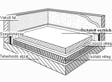 5.4.3. Az úsztatott esztrichet („Floating screeds”, ill. „Schwimmende Estriche”,) a teherhordó aljzattól egy hő és/vagy hangszigetelő réteg választja el. Az esztrichréteg teherelosztó szerepet játszik és rezgőrendszert hoz létre, amellyel javítható a lépéshangszigetelés. A határoló szerkezetekkel ez a szerkezeti felépítésű esztrich sincs közvetlen kapcsolatban.