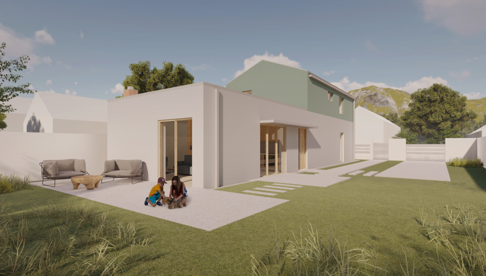A terv földszintes kerti tömege egy esetleges 2. ütem továbbépítésének lehetőségét adja, ami szintén nagy erény és egyben lehetőség lehet.