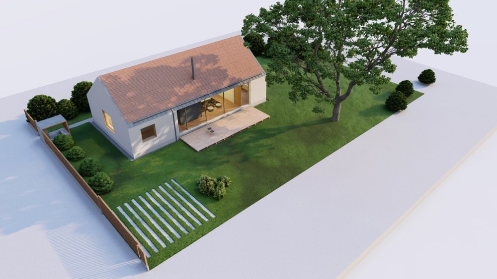 A pályamű relatív nagyobb (közel 1000 nm) telken old meg egy utcával párhuzamos főtömegű kompozíciót. Az itt nyeregtetős épület hátrébb fsz-es, lapostetős kialakítással folytatódik. Ez a tömegforma nem teszi lehetővé a terv fésűs beépítésű településeken való alkalmazását, ugyanakkor jó alternatívája lehet az országban nagy számban meglévő és néha igen alkalmatlan anyagokból épített „Kádár-kockák” kiváltásának.