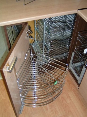 És hogy a számtalan konyhai eszköz, berendezés tárolása se okozzon gondot, a sarokszekrény maximális kihasználhatóságára forgatható-kihúzható szekrénybelsőt alkalmaztunk. Ez a megoldás ugyan nem tartozik az olcsó lehetőségek közé, de olyan helyeket, területeket is hasznossá tud tenni, melyek egyébként csak üresen tátonganának az egyébként szűkös konyhában.