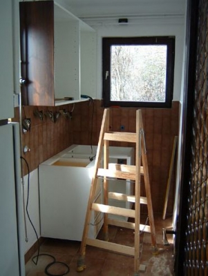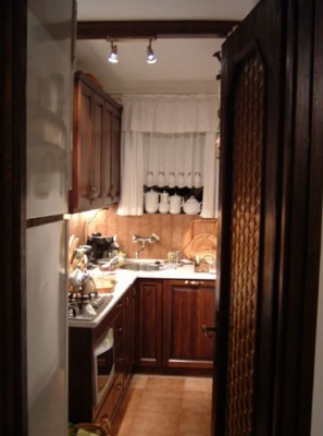 A rendelkezésre álló kis alapterület miatt – a helykihasználás érdekében – a konyhabútor felső elemei a mennyezetig érnek, a sarokszekrény pedig itt is speciális belső szerkezetet kapott. Mivel az épület betongerendás-kerámia béléstestes födémszerkezetű, így nem véshető, a mennyezeti lámpák áthelyezését máshogyan kellett megoldani: a bútorral azonos anyagú és színű, üreges fagerendát erősítettünk a mennyezetre, amelynek a belsejében átvezettük az elektromos kábelt az új helyre. A helyszűke miatt óvatosan kellett bánni a beépítendő konyhai berendezésekkel is, de főzőlapra, sütőre, hűtőgépre, mosogatógépre, mikrohullámú sütőre szükség volt. Szerencsére egyes gyártók már olyan – beépíthető- és szabadon álló kivitelű – kombikészülékeket is kínálnak, amelyek egy berendezésben egyesítik a mikrót és a hagyományos tűzhelyet, rengeteg értékes helyet spórolva ezzel az apró konyhákban. (Ezek a konyhai gépek sem olcsók, de a megfizethetetlen rakodóhelyért cserébe, amit ezek a készülékek a kettő az egyben elv alapján felszabadítanak, valószínűleg megéri a beruházás.) Egy ilyen készüléket építettünk be az új bútor alsó elemébe. A helytakarékosságot szolgálja a kisméretű, 9-10 terítékes, mindössze 45 centiméter széles mosogatógép is (bár ez a típus inkább egyfajta kényszermegoldás, hiszen ezeknek a pakolhatósága, a belső kialakításban rejlő praktikussága messze elmarad a hagyományos, 12 terítékes, 60 centiméteres szélességű társaiétól).