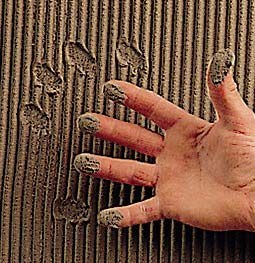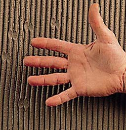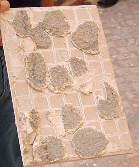 2. Kevés, csak egy-két pogácsányi ragasztóanyagot raknak a burkolólap hátoldalára, illetve nem alakítanak ki üregmentes ágyazatot, aminek következtében víz gyűlhet össze a burkolólap alatt/mögött. (Az üregmentes ragasztás azt jelenti, hogy a burkolólap alatt teljes felületen összefüggő a ragasztóágy, nincsenek benne üregek, melyekben összegyűlhet a víz.)