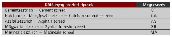Az esztricheket kötőanyagok szerint különböztetjük meg. Megnevezéseik az angol nyelvű jelölések rövidítéseire támaszkodnak.