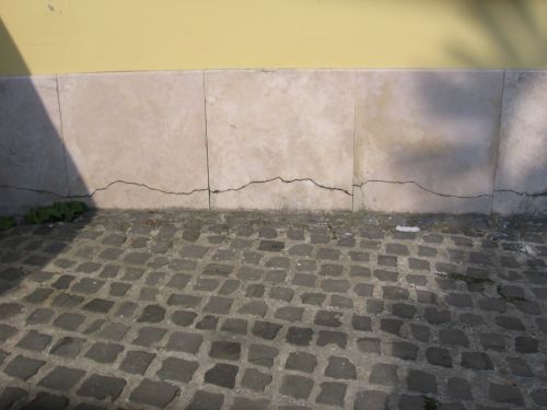 De mi történik akkor, ha a jól számított és megépített, és már sok éve-évtizede fennálló épület, építmény körüli talaj- vagy burkolt útfelületen, esetleg az alaptömb alatti talajrétegekben valamilyen változás következik be? Egy viszonylag ritka esetet a 2. fotón láthatunk: az utólag készült és a lábazatburkoláshoz kötött térburkolat eltörte, lehúzta, átrepesztette a lábazatot.