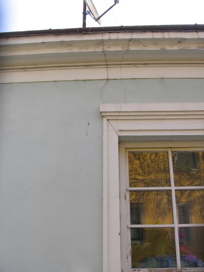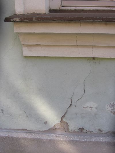 A 7. fotón egy, a közeli út- és járdaburkolat következében elmozdulhatott épületet mutatok be. Az egyébként több mint száz éves korúra becsülhető háromszintes épület sarkán ferde repedések jelentek meg. Az épület mozgásának követésére a megbízott statikus tervező elhelyezte már a gipszpogácsának becézett kísérleti felületet. Az ezt követő időszakban a gipszpogácsa körüli helyzetből, az esetleges további elmozdulásból, a továbbrepedésből és ennek mértékéből, a további elmozdulás időintervallumából leszűrtek alapján lehet majd a műemlék jellegű épület alapjainak esetleges megerősítésére tervet készíteni, az épület sarka alatt valamilyen formában a leendő stabilitást megtervezni.