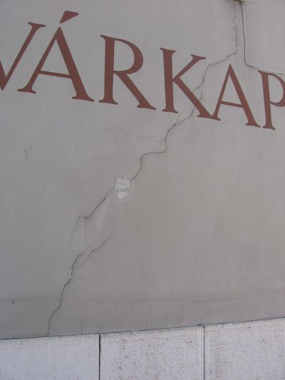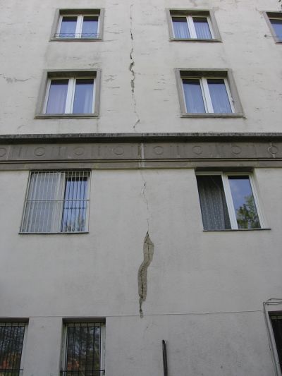 Végül egy „természetesnek" is nevezhető épületrepedést mutatunk be a 6. fotón, a kereken 60 méter hosszú, többemeletes épület megtervezett dilatációs hézaga a természetes épületmozgás következtében mintegy megjelent a homlokzaton. A tervező valószínűleg megfeledkezett a dilatációs hézag valamilyen módon való peremezéséről, a hézaglezárásról – az eredmény láthatóan megjelent a homlokzati vakolaton – a vakolat lepergésével tehát „jelentkezett” a hiba.
