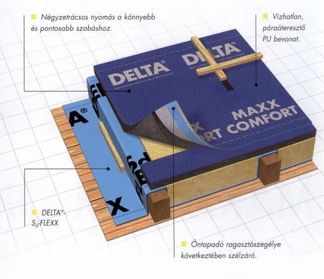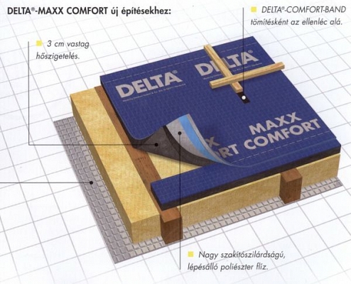 A Delta-Maxx Comfort új építésekhez történő alkalmazásakor belülre Delta-Reflex légzáró és párafékező réteget kell fektetni, mellyel 10 százalékkal jobb hőszigetelés, 50 százalékos hőreflektáló hatás, illetve 100 százalékos lég- és párazárás érhető el.