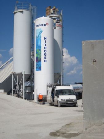 A Daimler AG cégcsoport első kelet-európai gyára épül jelenleg Kecskeméten. Az új üzemben az év végén indul be a prémium kategóriájú Mercedes gépkocsik gyártása. Az üzemcsarnokok jelentős részét a Strabag MML Kft. építi, az ehhez szükséges betont partnerünk, a Frissbeton Kft. szállítja. Ahhoz, hogy az üzemben időben megkezdődhessen a gépkocsigyártás, feszített munkamenetet kell tartani, a nyári hőségben is folynak a munkálatok. A beton bedolgozása 5 és 25 oC között optimális. Amennyiben a frissbeton hőmérséklete e tartományon kívül esik, gyengülhet a beton minősége (nehezen bedolgozhatóvá, és nem eltarthatóvá válik, repedések keletkeznek a betonban). A Frissbeton Kft. ezért a Messert bízta meg a cementhűtésével, hogy a frissbeton bedolgozásához ideális hőmérsékleti tartományt a nyári melegben is biztosíthassa. Ehhez cseppfolyós nitrogénre (LIN) volt szükség. A Mercedes üzem telephelyén felállított 50 m3-es tartályból látta el a Messer július elejétől a vevőt, az időjárás függvényében adagolva nitrogént. A cseppfolyós nitrogént a tartályból speciális, szigetelt flexibilis csöveken át a két cementsilóba vezették be a cement átfejtésével egy időben. A nitrogénmennyiség szabályozott adagolásával a cementet így optimális hőmérsékleten tárolták be (Cryoment-Flow eljárás).