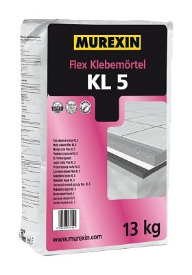 Murexin KL 5 Flexragasztó (C2TE S1), mely poralakú, élelmiszerbarát, rendkívül kiadós (+20%), magas fagyállóságú, hőtároló képességű, különösen könnyű, nem éghető, víztaszító, hidraulikus kötésű flexragasztó különleges tulajdonságokkal. Kül- és beltérben alkalmazható minden típusú kerámiaburkolatok és természetes kövek ragasztásához, valamint falon és padlón történő kiegyenlítéséhez.