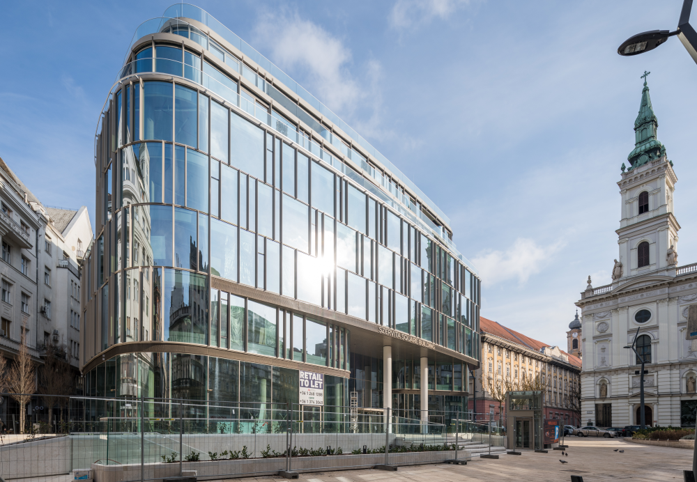 Budapest egyik legújabb ingatlanfejlesztése a belváros frekventált, de mégis intim pontján épült – a Szervita téren. Mi fiatal korunkban Martinelli térnek ismertük. A huszadik század viharos történelme során egy ideig nem viselhette régi és egyben új nevét, de milyen találó, hogy ez idő alatt azon kevés közterületünk egyike volt, amit építészről neveztek el. (Martinelli az Invalidus-ház – a mai Városháza – hatalmas barokk tömbjének építésze volt.) A tér ugyanis szinte hemzseg a különböző korok értékes építészeti emlékeitől: kezdve a Szent Anna-templom neoreneszánsz homlokzatától a klasszicista lakóházakig és a tér nyugati oldalát határoló páratlan szecessziós és korai modern épületekig. Az új irodaház helyén valaha a nagy múltú Károlyi-palota állt, de erre már alig emlékezhet ma valaki, mert a háborúban találatot kapott, majd helyreállítás helyett városrendezési okokra hivatkozva inkább lebontották. Ezután a telek jó ideig üresen állt, majd a hetvenes években felépült a szocialista modernizmus jegyében az OMFB-székház és a vele összekapcsolt parkolóház tömbje, mely a tér legfiatalabb épületeként a leggyorsabban öregedett, és a szemközti Távközlési Központtal együtt mára eltűnt, s így ennek a kornak a téren nyoma sem maradt. És ez volt az a telek is, ahová Zaha Hadid a sok vitát kiváltott üvegkavicsnak nevezett épületét tervezte, mely a múltnak fittyet hányva hirdette volna a legújabb korok üzenetét, ezt azonban elsodorta a 2008-as gazdasági válság, majd a beruházó csődje. Ide épült tehát egy új irodaház, amelynek finoman tagolt, ívelt üveghomlokzata kulcsfontosságú szerepet kapott abban, hogy a ház modernsége mellett alázattal illeszkedjen a múlthoz is. Illeszkedik, mert legömbölyített formáival belesimul a térbe, számtalan szögben visszatükrözi a környezetét, de illeszkedik azzal a szemléletével is, hogy a régi korokra jellemző műgonddal kezeli a homlokzati részleteket.