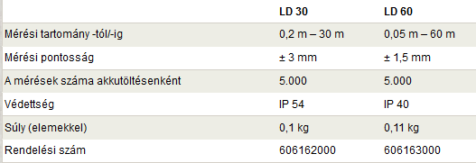 A bel- és kültéren egyaránt használható, gombnyomásra mérő és egyszerűen kezelhető LD 60 távolságmérő nyolc funkcióval rendelkezik: hossz és felületmérés, térfogatszámítás, Pitagorasz 1 és 2 funkció, folyamatos mérés, minimum és maximum követés.