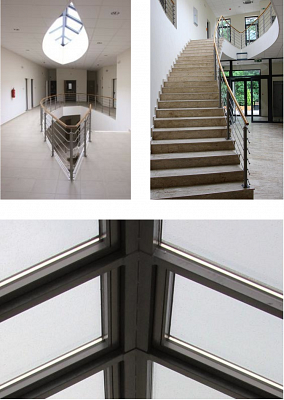 Az épület szerves részét képezik az Aliplast hőhídmentes homlokzati, illetve hőhidas beltéri nyílászárói, valamint a lencse alakú, fügönnyfal rendszerből készült felülvilágító és az abba integrált, kifelé emelkedő tetőablakok.