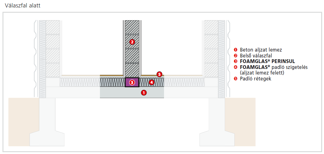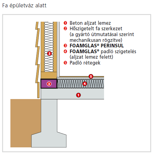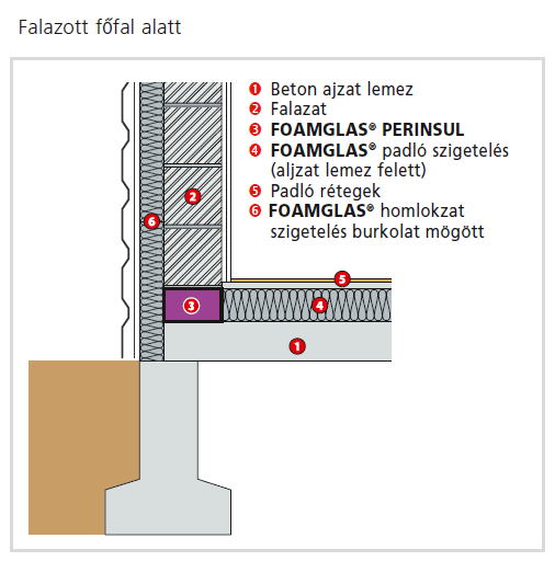 Energiahatékonyság szempontjából a legkritikusabb szerkezeti részlet a padló és a külső fal csatlakozása, illetve a lábazati zónában a falak alatti felületek. A Foamglas Perinsul habüveg anyagú hőhídmegszakító elem, amely hőszigetelt kapcsolatot alakít ki padlók, falak, tetők és nyílások csatlakozásainál. A panel megoszló nyomással terhelhető, teljesen víz- és páraálló.