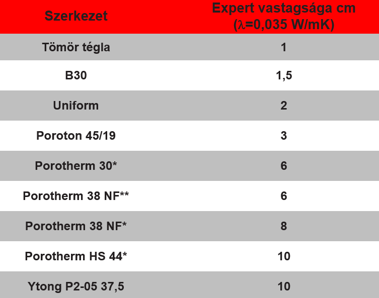 Az igazi feladat viszont az anyagváltás miatt kialakuló hőhidak kiküszöbölése. Amennyiben mindenképpen kétféle anyagot (például 38 NF tégla és vasbeton pillérváz) kell alkalmaznunk, úgy a rosszabb hőszigetelő képességű anyagot megfelelő vastagságú szigetelőanyaggal kell burkolni. Ez annál vastagabb lesz, minél jobb a téglafal hőszigetelő képessége. Egy B30-as falazat esetében 1,5 cm vastag Expert is elegendő, de a korszerű téglákra akár a 8-10 cm sem túlzás.