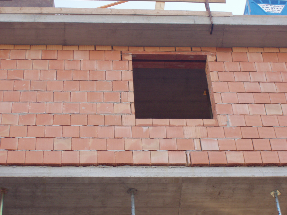 Ezek már jelentős vastagságok. A hőszigetelés helyigénye miatt a falazóblokkokat úgy kell elhelyezni, hogy a külső síkjuk a pillérek külső síkjához képest a szükséges mértékben kijjebb helyezkedjen el. Ráadásul, mivel a hőáramok a szigetelőanyagot meg tudják kerülni, a hőszigetelést a falvastagság kétszeresének mértékében (50-80 cm) mindkét irányban túl kellene nyújtani. Ezeket a lépéseket pedig nemcsak a pilléreknél, hanem a födémeknél, áthidalóknál is el kell végezni. Látható, hogy a jó hőszigetelő képességű falazóanyagokból létesített kitöltőfalazatok hőtechnikailag pontos kivitelezése nem egyszerű. Lényegesen egyszerűbb, ha a két anyag (kitöltőfalazat és a vasbeton váz) hővezetési tényezője között nincs olyan nagy különbség, és az egész homlokzat kap 15 cm vastag Grafit Reflexhőszigetelést. Ezzel a hőhidak gyakorlatilag eltüntethetők.
