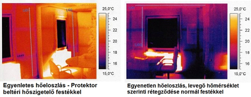 A Protektor festék hőkamerás mérések alapján megemeli a kezelt térfelület felületi hőmérsékletét és így csökkenti a levegő hőmérsékletéhez képesti különbséget.