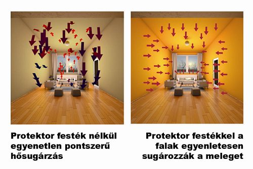 A Protektor hőszigetelő festék használatával a falak visszaverik a hőt, így a helyiségben a pontszerű fűtés helyett sugárzó hő érkezik a Protektorral lefestett falakról. Ezen kívül a Protektor hőszigetelő festék hőkamerás mérések alapján megemeli a kezelt falfelület felületi hőmérsékletét és így csökkenti a különbséget a határoló felület hőmérséklete és a levegő hőmérséklete közti különbséget.
