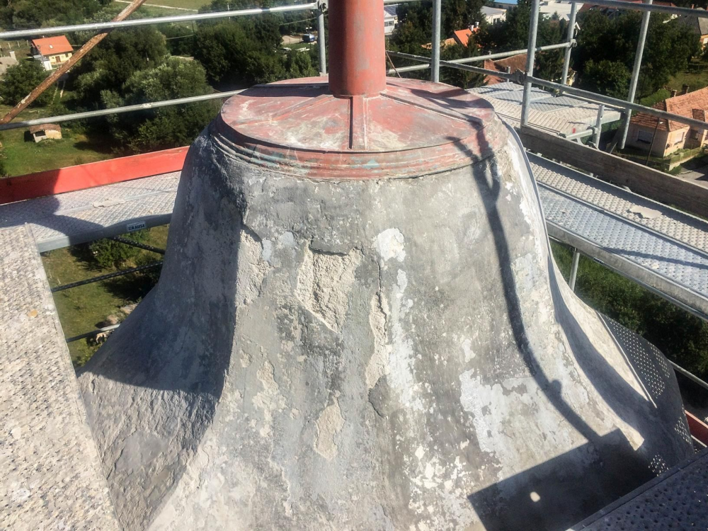 A felújítandó felületen jól láthatóak voltak a korábbi kent szigetelések nyomai, repedezett, töredezett, hiányos felülettel. A feladat a betonkupola csapadékvíz elleni szigetelése és egyben a szerkezetbe korábban bejutott nedvesség eltávozásának biztosítása volt, de a megjelenés is számított, ezért a megrendelő az eredeti betonozott felülethez legjobban hasonlító RAL 7030 szín mellett döntött.