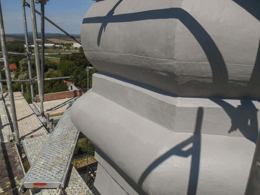 A Kemperol termékek ellenállnak a nagy hőingadozásoknak, UV-állók, hosszú időn keresztül megőrzik rugalmasságukat, és mechanikai védelmet nyújtanak a felületnek. Az állványzatról és a felület előkészítéséről a megrendelő gondoskodott; a felújítás körülbelül 2 hétig tartott. A kivitelezést csak a néha megerősödő szél akadályozta, a munkakörülmények megfelelőek voltak. A munka átadásával hosszú időre megoldódott a nehezen megközelíthető részek tartós védelme, és nem csorbult a részletgazdag megjelenésből adódó esztétikai élmény sem.