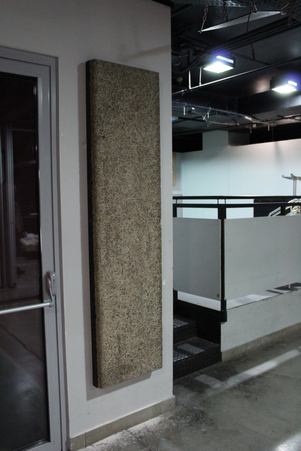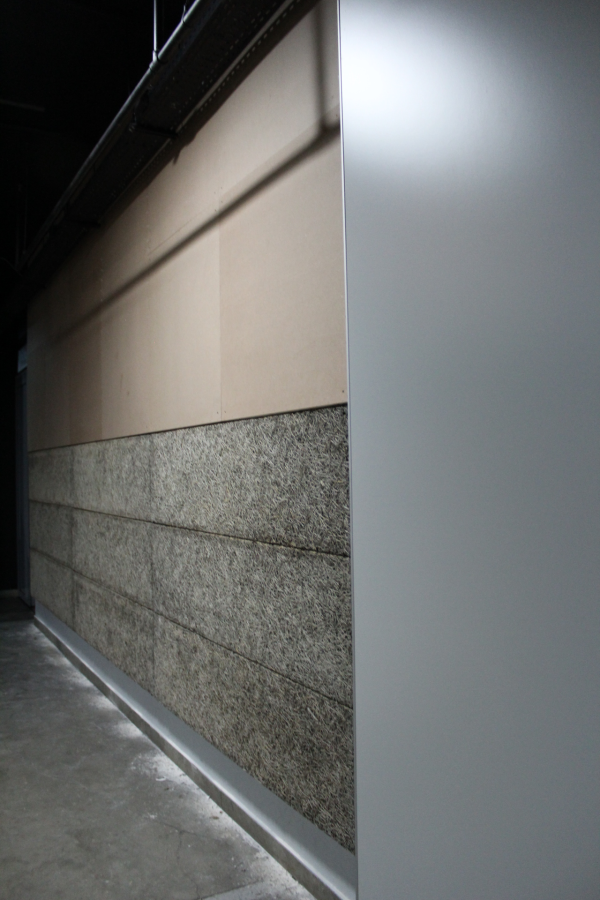 A végleges terv szerint a mennyezeten és a falfelület felső részén speciálisan mélyfrekvenciára hangolt elemeket helyeztek el, amelyekbe szálas szigetelőanyag, környezetbarát, Ecose kötőanyagú ásványgyapot került. A falak alsó szakaszára szélessávú hangelnyelő felületként – a gyakori rendezvények és a várhatóan nagy létszámú közönség miatt a szilárdsági és ütésállósági tulajdonságokat is figyelembe véve – 50 mm vastag Heraklith-C lapokat szereltek, a hangelnyelés növelése céljából 50 mm-es lécvázra rögzítve, a váz között 50 mm vastag, közepes sűrűségű, szintén Ecose kötőanyagú ásványgyapot szálas szigetelőanyaggal. A kedvező mechanikai tulajdonságokkal rendelkező Heraklith-C lapok alkalmazásának belsőépítészeti előnye, hogy a RAL színskála szerint gyárilag festetten és élletöréssel (fózolással) is rendelhető, így az anyag esztétikus megjelenésű anélkül, hogy a hangelnyelése romlana.