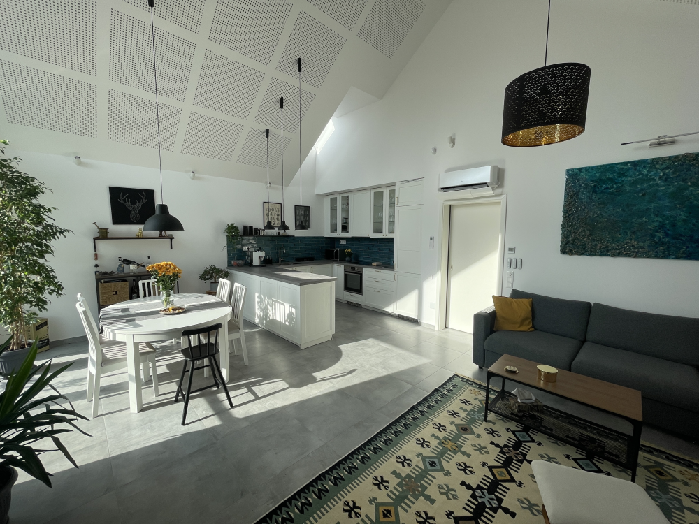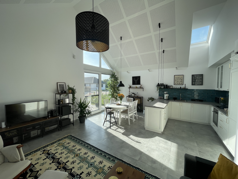 A gárdonyi mintaház modern, letisztult épülettömegéhez a legmagasabb műszaki paraméterek társultak. A már 120 és 150 m2-es verzióban is elérhető ház alaprajza tökéletesen illeszkedik a modern családok életviteléhez: a ház intimebb részeitől leválasztott, hatalmas belmagasságú nappali ideális színtere a mindennapoknak és az összejöveteleknek.