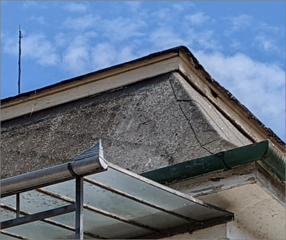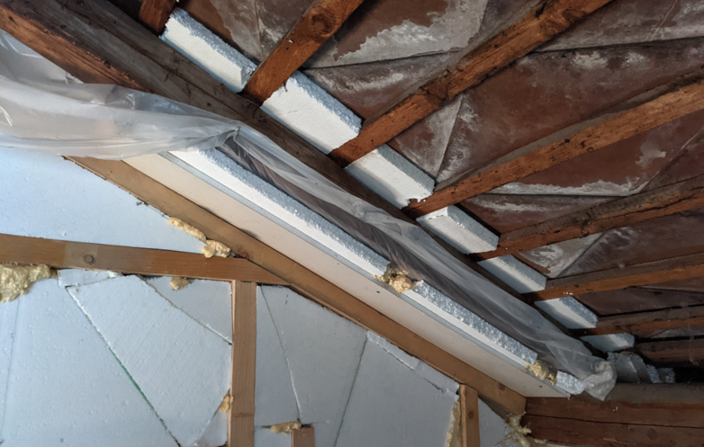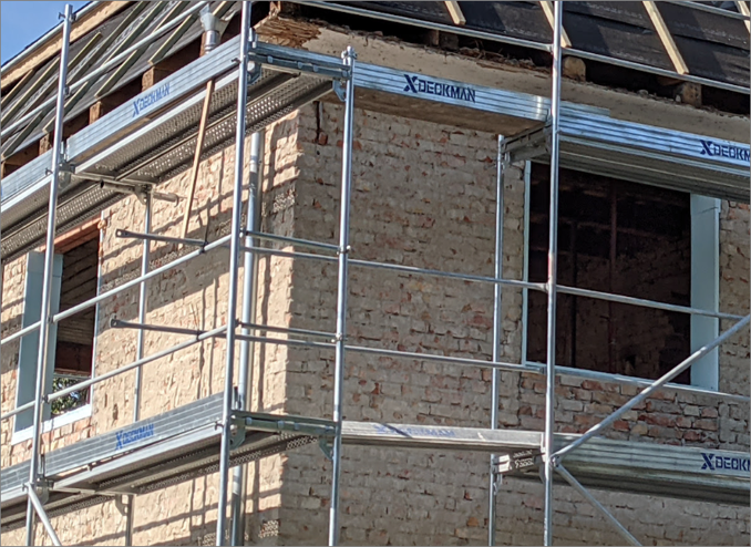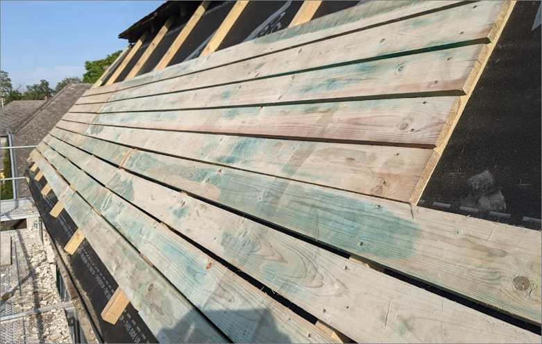 A deszkázatnál réselt megoldást használtak. Fontos tudni, hogy a deszkázat csakis legalább 22 mm vastagságú OSB3 vagy OSB4 lapokkal váltható ki, és további szabály, hogy a 7 fokos hajlásszög alatti tetők esetében a korcokat falczselével is tömíteni kell. Szintén jó tudni, hogy az ereszvonal mentén kötelező hófogót használni, ami jelen esetben kétcsöves megoldással valósult meg.