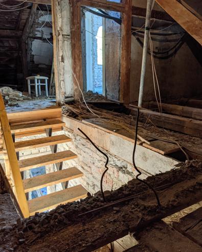 A toronyszoba kapcsán az egyik döntő kérdés volt, hogyan lehet majd feljutni oda. Erre több lehetséges megoldás is született, többek között egy panorámalift terve is képbe került, ami bár látványos, de költségei miatt azonnal el is vetették, és hagyományos lépcsős megoldás mellett döntöttek. A lépcső eredeti kialakítása anno nem túl átgondoltan történt. A helyét egy 20×20-as fa födémgerenda kettévágásával alakították ki, így a tartófunkciót valamivel pótolni kellett, ezért nemes egyszerűséggel acéldrót segítségével egy pallóhoz erősítették. A hőszigetelés problémáját is igen „kreatívan” oldották meg a korabeli „szakemberek”: amit találtak, minden átgondoltság nélkül felhasználtak e célra.